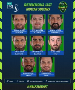 PCB Multan Sultans retained Shahid Afridi and Riley Russo in Platinum, Sohail Tanveer Imran Tahir Khushdal Shah in Diamond and James Owens, Shaun Masood and Usman Qadir in Gold.