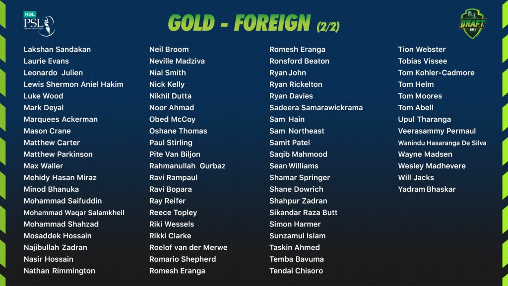 Quetta Gladiators selected Chris Gayle and Tom Benton in the Platinum category, Usman Shinwari in the Gold category and Cameron Delport, Qais Ahmed, Muhammad Faizan and Abdul Nasser in the Silver category.
